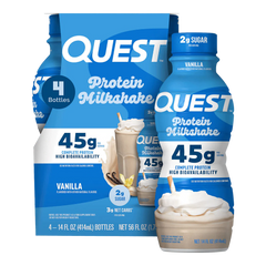 Cheat on milkshakes with milkshakes. Quest Strawberry Flavored Protein Milkshakes deliver fruity indulgence with the macros you’d expect from Quest. Each serving features a whopping 45g of protein*. And with 2g of sugar and 4g of net carbs* these protein shakes are the ultimate cheat code. Made with ultrafiltered nonfat milk, they’re just right for whenever you need a delicious protein boost. Whether it’s snacktime, post-workout, or dessert - enjoy the sweet, satisfying taste you love while crushing your protein goals. Stock up on these tasty high protein milkshakes and all your other Quest favorites, from bars and chips - to cookies, candies, and more.